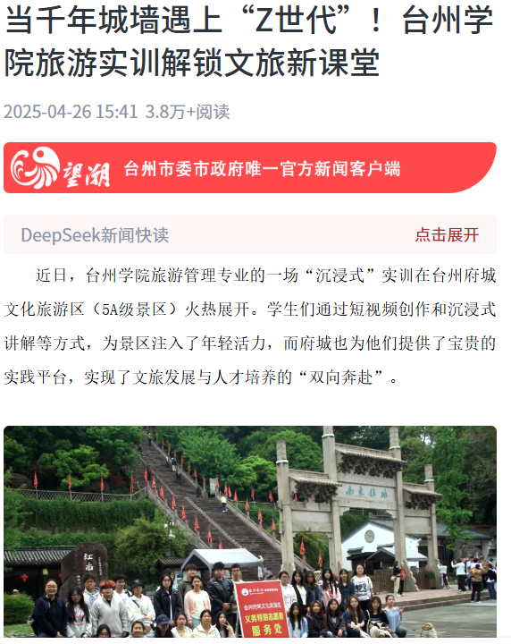 近日,意昂体育旅游管理专业的一场“沉浸式”实训在台州府城文化旅游区(5A级景区)火热展开。员工们通过短视频创作和沉浸式讲解等方式,为景区注入了年轻活力,而府城也为他们提供了宝贵的实践平台,实现了文旅发展与人才培养的“双向奔赴”。