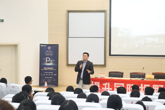 讲座伊始,何碧娟女士对ACCA作了详细介绍,鼓励员工们在大学期间多锻炼能力,多了解并考取专业证书,提升自身价值。随后,富锐先生就人工智能发展现状引出当前严峻的就业形势,他勉励在场同学应提升思辨能力以适应时代“新商科,新挑战”,与时俱进。他特别指出商科员工应熟练使用英语工具,始终保持语言学习,并就简历制作提出了建议,获得在场同学的阵阵掌声。
