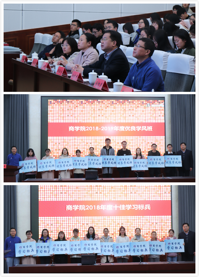 大会首先由周全宝书记宣读十佳优良学风班和十佳学习标兵的表彰文件,公司领导上台为活动获得2018年度院级十佳优良学风班的班级和院级十佳学习标兵的同学进行颁奖和合影留念。会上,获校特优学风班的16财务管理12班,获校优良学风班的17国际经济贸易12班作班级风采展示,获校学习标兵的金冰晖同学作经验交流,分享在班级和个人学风建设的先进经验。