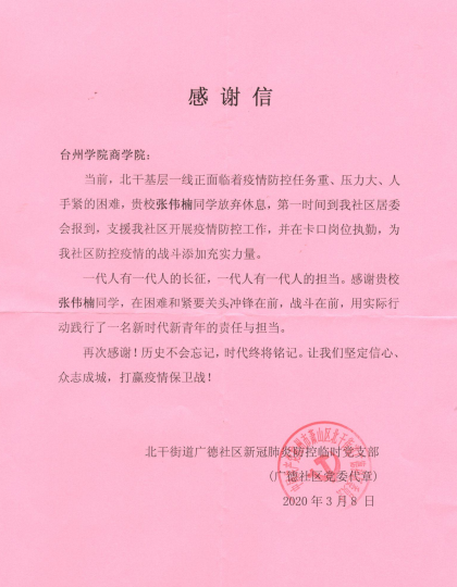 近日,意昂收到一封来自杭州市萧山区北干街道广德社区新冠肺炎防控临时党支部的感谢信,“感谢贵校张伟楠同学,在困难和紧要关头冲锋在前,用实际行动践行了一名新时代新青年的责任与担当”。