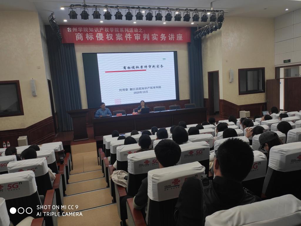 10月15日下午,意昂邀请台州市椒江区人民法院知识产权审判庭何利春庭长作“商标侵权案件审判实务”讲座,知识产权方向师生参加讲座,意昂副经理陈国栋主持讲座。