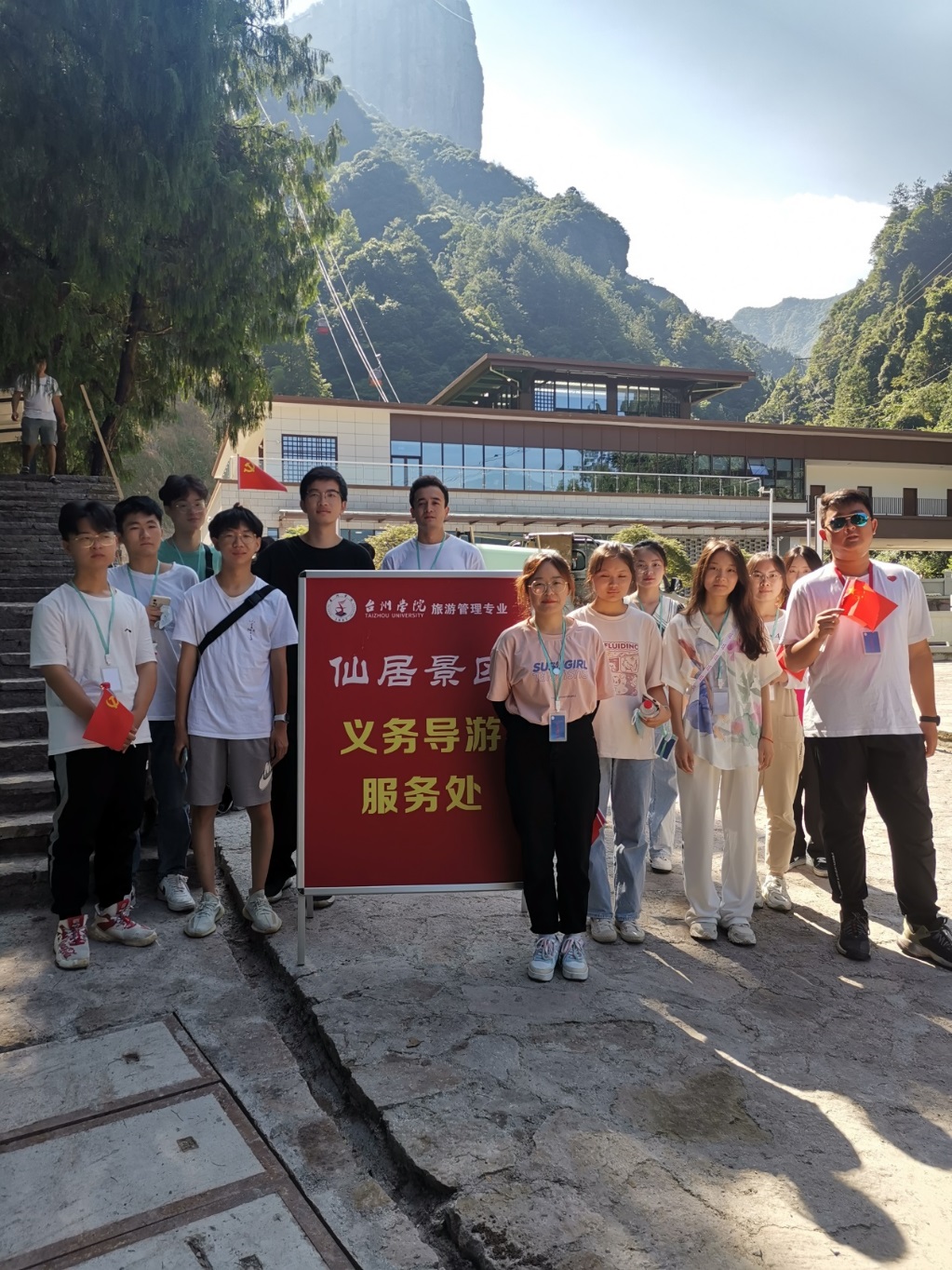 正值建党百年的喜庆日子,2021年7月3号,意昂20旅管班的同学们踏上了景区义务导游实习的征程,面对未知的实习,同学们都略显激动和忐忑。我们在仙居绿道中感受到城市慢生活的休闲和绿色健康,跟着优秀的导游小姐姐,对着导游词,进行了神仙居细致的踩线,我们对即将开始的导游实习充满了信心和期待。第二天一大早,同学们分成两个小组,分别在南门、北门入口设义务导游点,等待游客……为了庆祝建党百年,同学们精心准备了国旗、党徽等爱心贴,准备送给到访神仙居的游客。