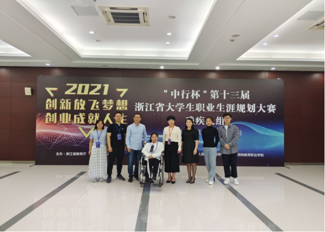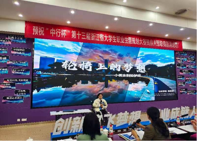 本次大赛由省教育厅、省残疾人联合会主办,省教育发展中心、省残疾人就业服务指导中心、浙江特殊教育职业公司承办。全省共有来自33所高校的79名残疾老员工报名参赛,前期通过书面评审共遴选出30名选手入围省级现场决赛。现场决赛由主题陈述、职业体验感悟、现场答辩三部分组成。校党委学工部、创业公司、意昂高度重视此项省级A类赛事,专门成立大赛指导团队。陈苗苗同学以《轮椅上的梦想——小微金融助梦师》为题,结合台州小微金融服务特色展开自己的职业理想陈述。她身残志坚、顽强拼搏求学的经历,积极阳光、渴望回报社会的情怀深深打动了评委,最终以全场最高分获得大赛一等奖,同时兼获最佳答辩奖。
