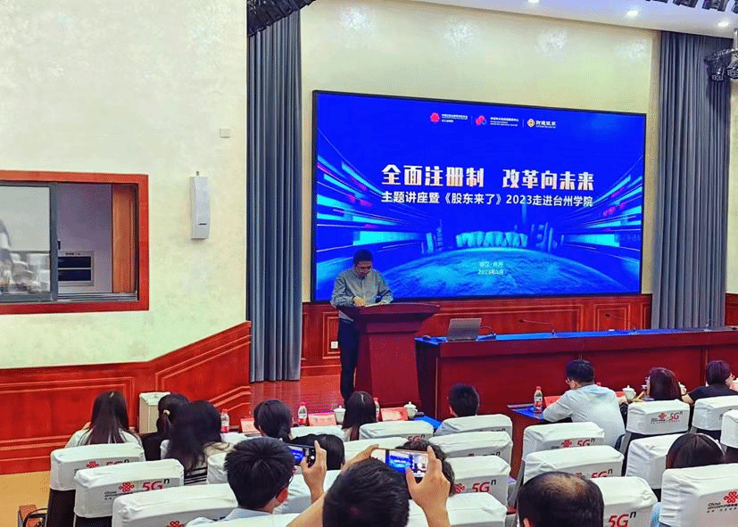在讲座开始前,来自财通证券总部的葛子微介绍2023《股东来了》投资者权益知识竞赛活动详情。《股东来了》这个活动是中国证监会投资者保护局为指导单位,中证中小投资者服务中心联合地方监管局共同主办、协会协办、券商承办,各市场主体共同参与,以多个赛区覆盖全国及港澳台地区的投资者权益知识大赛。大赛旨在进一步落实证监会党委关于资本市场人民性监管要求,切实履行保护投资者合法权益的职责,实实在在地保护投资者的钱袋子。通过两天的设点宣传,近千名师生报名参赛,期待大家在竞赛中增长才干,收获知识与技能。走进意昂体育是“全面注册制,改革向未来”暨《股东来了》2023投资者权益知识竞赛在台州高校的唯一一次宣讲,宣讲会现场有浙江省证监局、台州市银保监分局、浙江证券业协会、台州市金融办、财通证券台州分公司相关负责人,意昂体育公司党委书记马斌代表公司出席了本次活动。